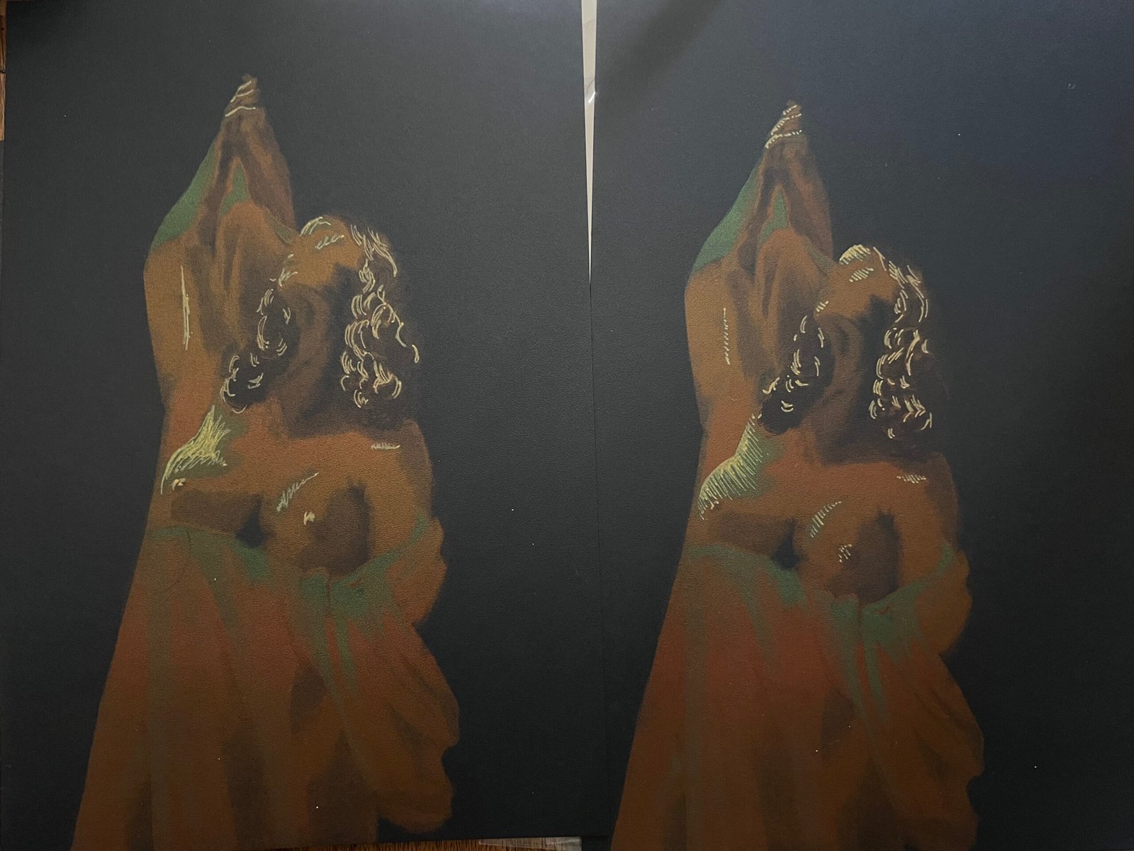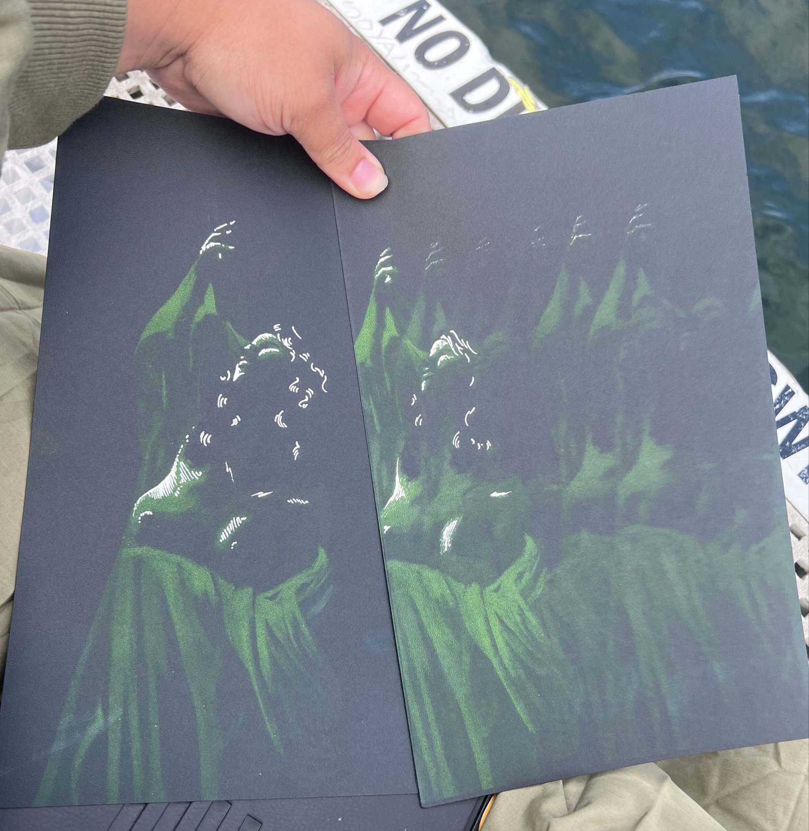 Resulting from materials experimentation, this print uses RISO printing techniques and some materials experimentation. The use of the coated and textured black paper creates a unexpected effect; reacting with the pigment to shift the original colors. This print was made using Red and yellow ink, which resulted in orange and green!